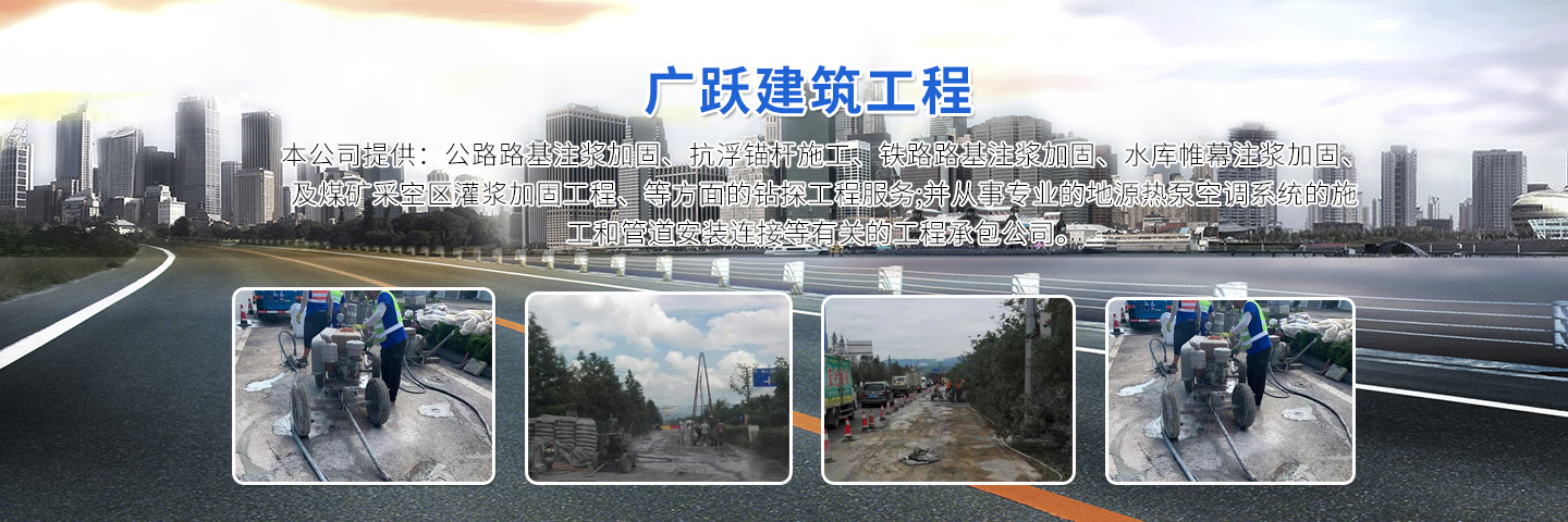 徐州廣躍建筑工程有限公司,公司成立于2010年,有專業施工人員50人,從事專業加固注漿施工。 本公司提供:公路路基注漿加固、抗浮錨桿施工、鐵路路基注漿加固、水庫帷幕注漿加固、及煤礦采空區灌漿加固工程、等方面的鉆探工程服務;并從事專業的地源熱泵空調系統的施工和管道安裝連接等有關的工程承包公司。 公司成立以來一直專注于地質鉆井工作,技術力量雄厚、設備先進:擁有專業的機械地質鉆井精英隊伍;并具有GSY --150鉆機30余臺、GSY---200鉆機20余臺、專業回填封孔砂漿泵4臺等機械設備。公司稟承“優質的工程、優惠的價格、優良的售后服務”的經營理念,以“客戶滿意”為原則,著力打造一支高效、專業、信譽的工程服務團隊。 具體服務項目:工程施工降水井、水源空調井、地源熱泵井、機鉆深井(工廠專用井)、石頭井、飲用水井、農田井、地基降水處理、大型基坑降水、地下室、車庫以及橋梁注漿加固等業務??捎糜趶S生產用水,機械冷卻用水和生活用水,用水量可根據貴公司的需求量身訂做。